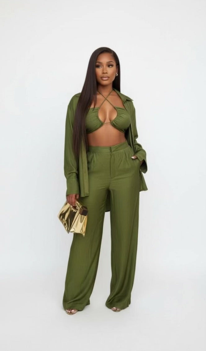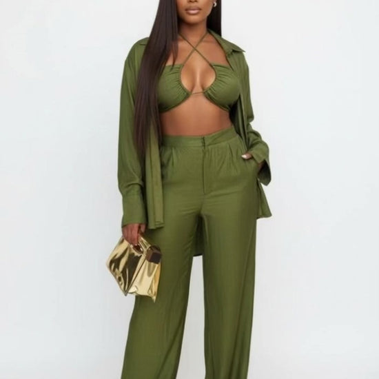 Three-piece halter cut-out bralette; high-waisted wide-leg pants; and a button down shirt